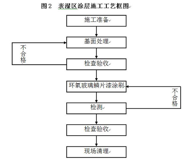 (3)底層、面層施工:本工程表濕區(qū)涂裝采用底面合一涂層,施工采用高壓噴槍、滾筒、刷子噴涂或涂刷環(huán)氧玻璃鱗片漆,施工現(xiàn)場配備計量設(shè)備,嚴格按照配合比添加各種材料用量,環(huán)氧玻璃鱗片漆干膜厚度為350微米。