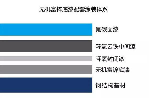采用無機富鋅底漆處理的底材,固化后的涂膜與鋼材的附著力強,與高性能涂料相配合,涂層壽命可以在15年以上。這是目前橋梁、建筑、鋼結構采用最多的重防腐底漆系統。