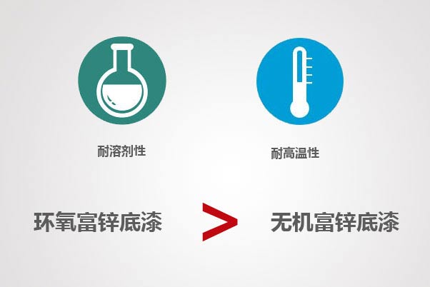 耐溶劑性,無機富鋅底漆的耐溶劑性能好于環氧富鋅底漆,例如作為油罐內壁防腐漆,無機富鋅底漆更合適。